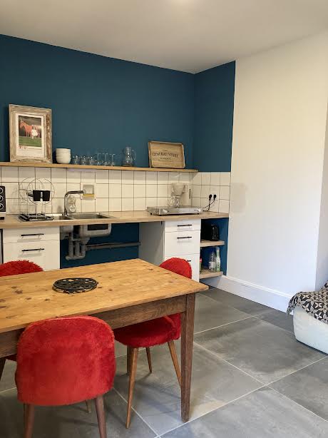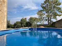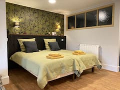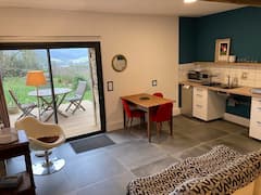 En 2 niveles, separados por 2 escalones, es accesible desde la terraza. Para 2 personas, dispone de camas gemelas (2x90x200) adaptables según las necesidades. El cuarto de baño está dividido, con ducha y WC adaptados para personas con movilidad reducida (PMR) u otras discapacidades. La cocina totalmente equipada (placa de inducción, horno, nevera) da acceso a la terraza privada con vistas a la cordillera de los Pirineos. La piscina sobre el suelo está a su disposición. Accesible en silla de ruedas (superficie inclinada amovible a petición: pendiente del 15% sobre 2,10 m, que permite el acceso desde el salón hasta el dormitorio).