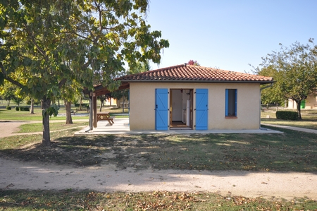 12 casas construídas en espacios a la sombra:salón/cocina,cuarto con cama de matrimonio,cuarto con 2 camas,wc.cuarto de baño,terraza con mesa de picnic,sala de animación con tv,bibliotecas,juegos,volley,lavandería,barbacoa.En julio y en agosto:acceso al lago.